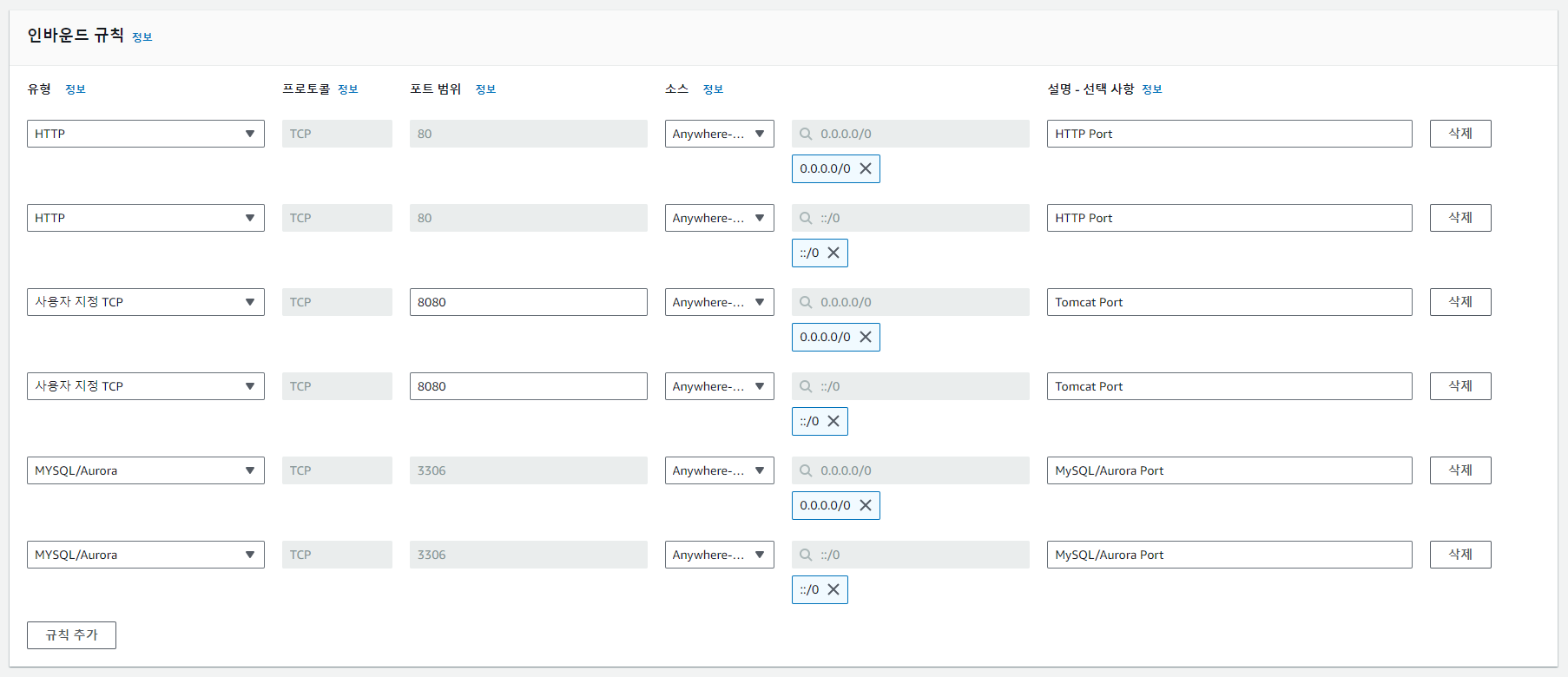 - 다음과 같이 인바운드, 아웃바운드 규칙을 적고, 보안 그룹 생성
